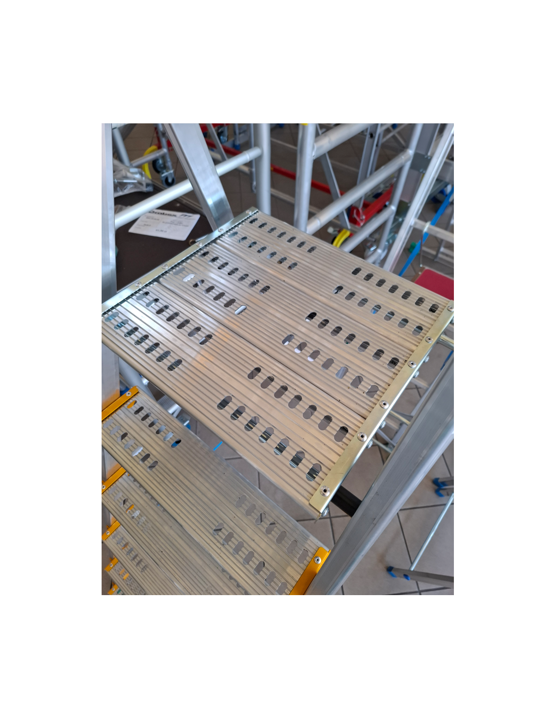 Szeroki, wygodny podest roboczy o wymiarach 0,37 × 0,35 m zapewnia stabilne i komfortowe stanie podczas pracy.
