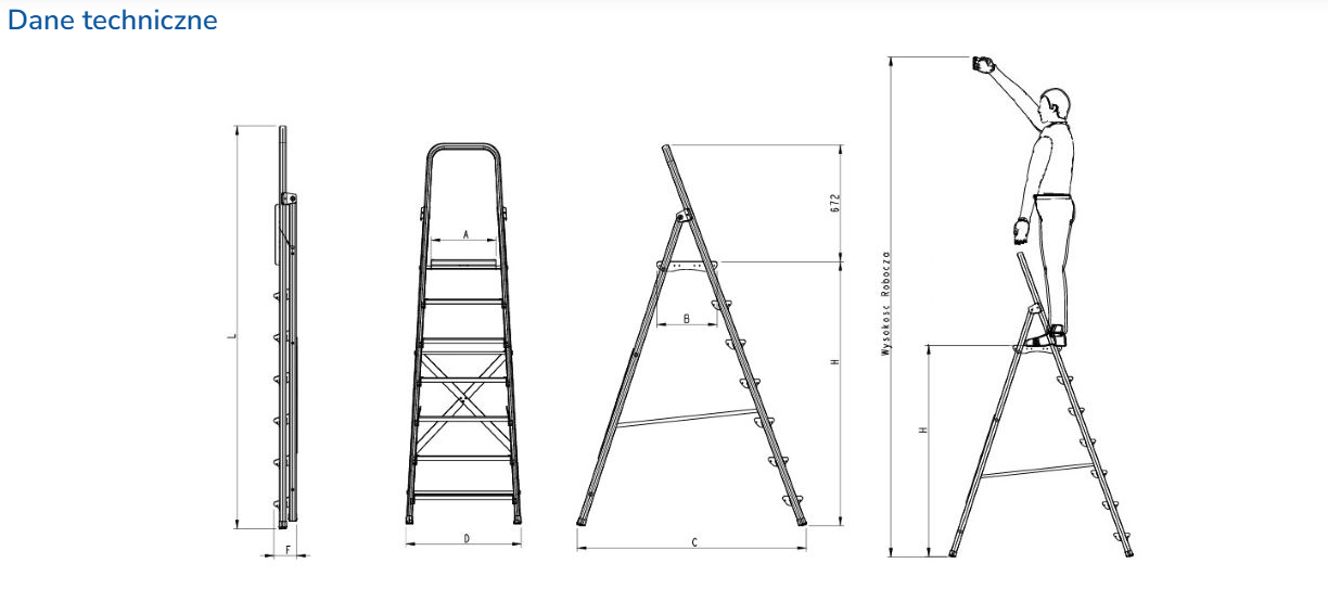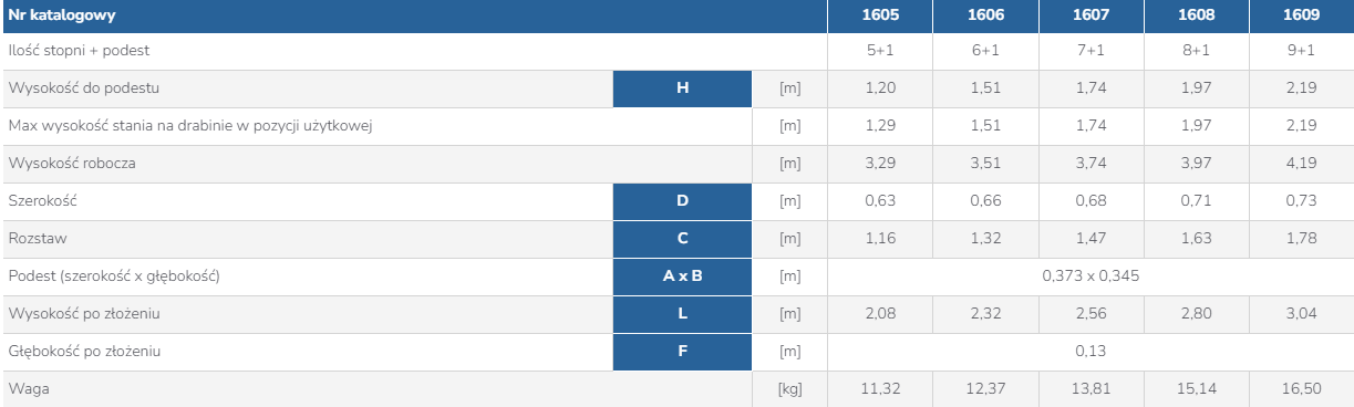 Drabina dostępna w wariantach: 1605, 1606, 1607, 1608, 1609, różniących się liczbą stopni i wysokością roboczą.